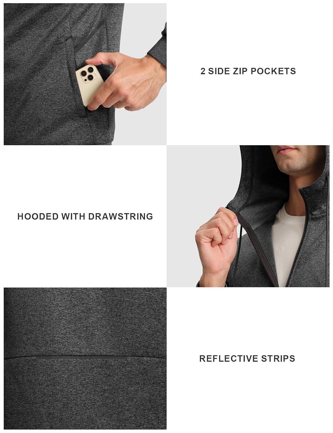 - Hoodie Jacket: The track jacket with full zip closure.;2 slant zippered pockets that is storage your phone and wallet safely