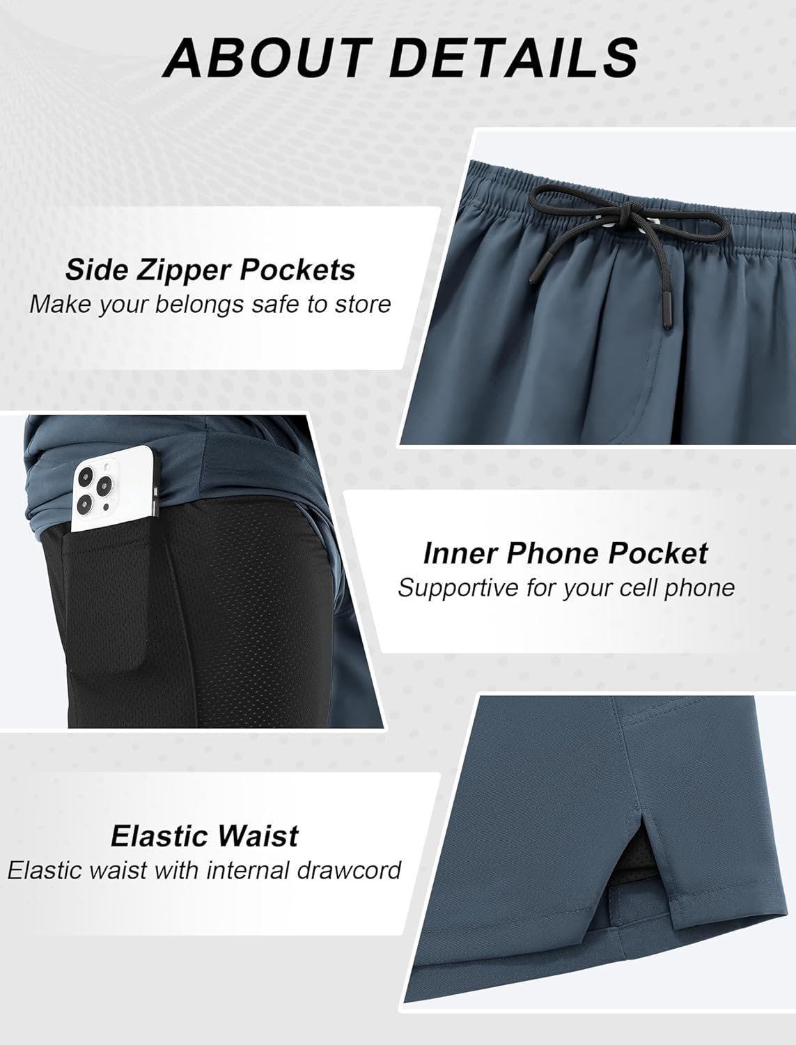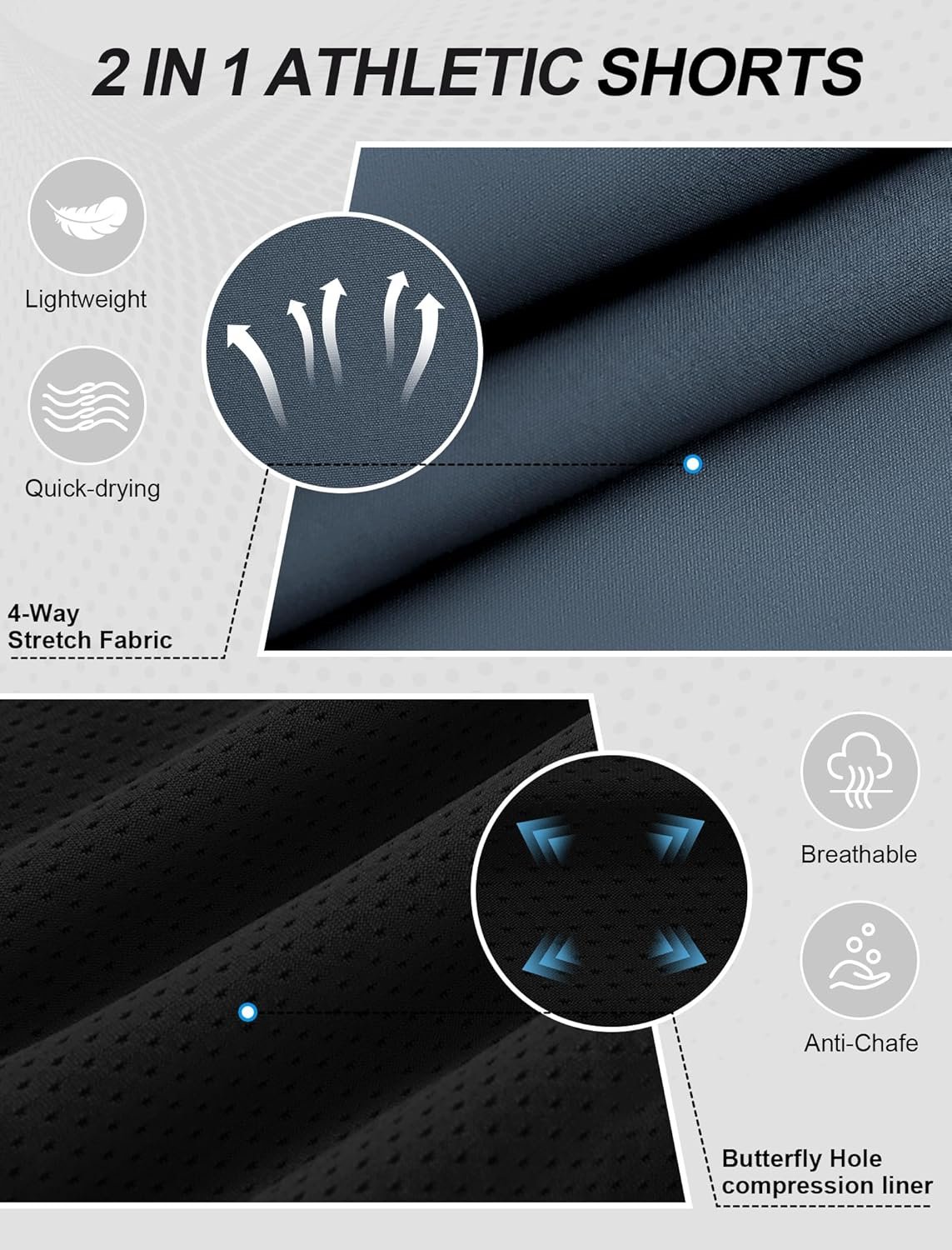 - 2-in-1 ultra-light Training Shorts for Men – Built-in compression liner minimizes chafing vs traditional athletic shorts while supporting thigh muscles to boost performance. Super lightweight fabrics in the front and inner briefs make for a 4-way stretch and what you get is a weightless feel.
